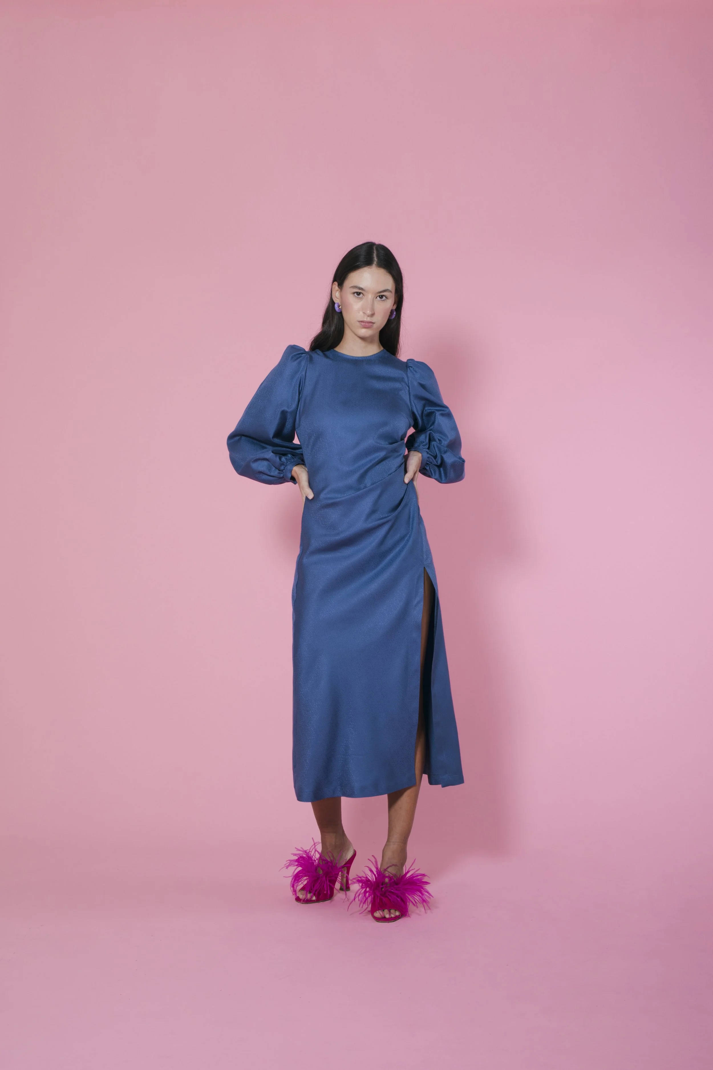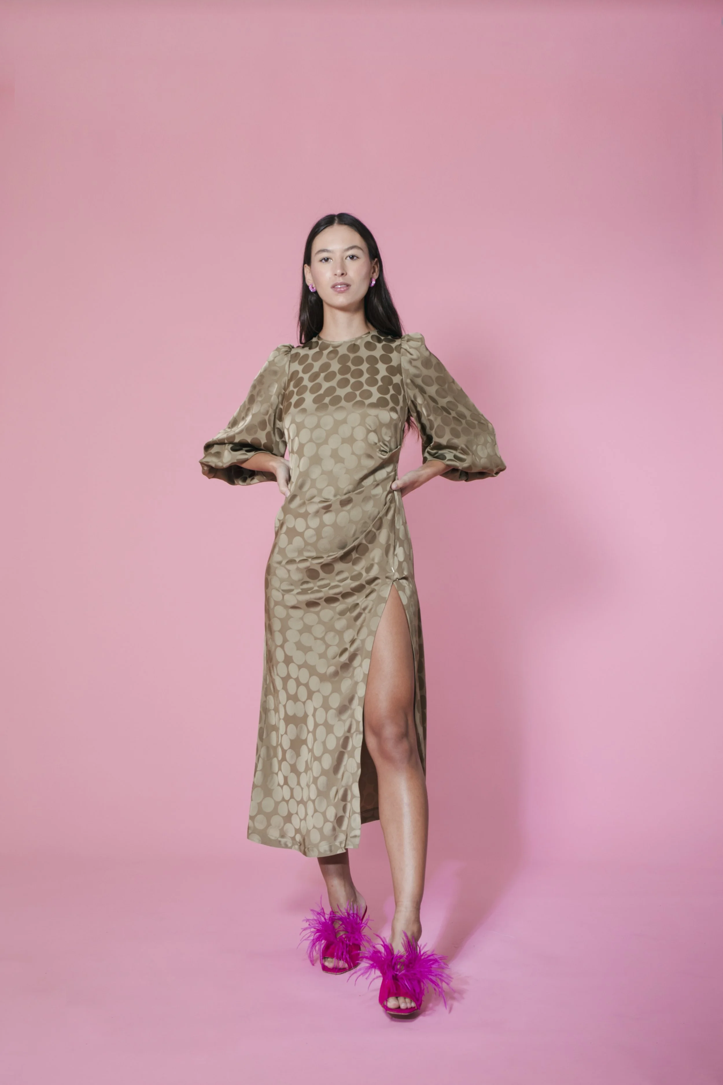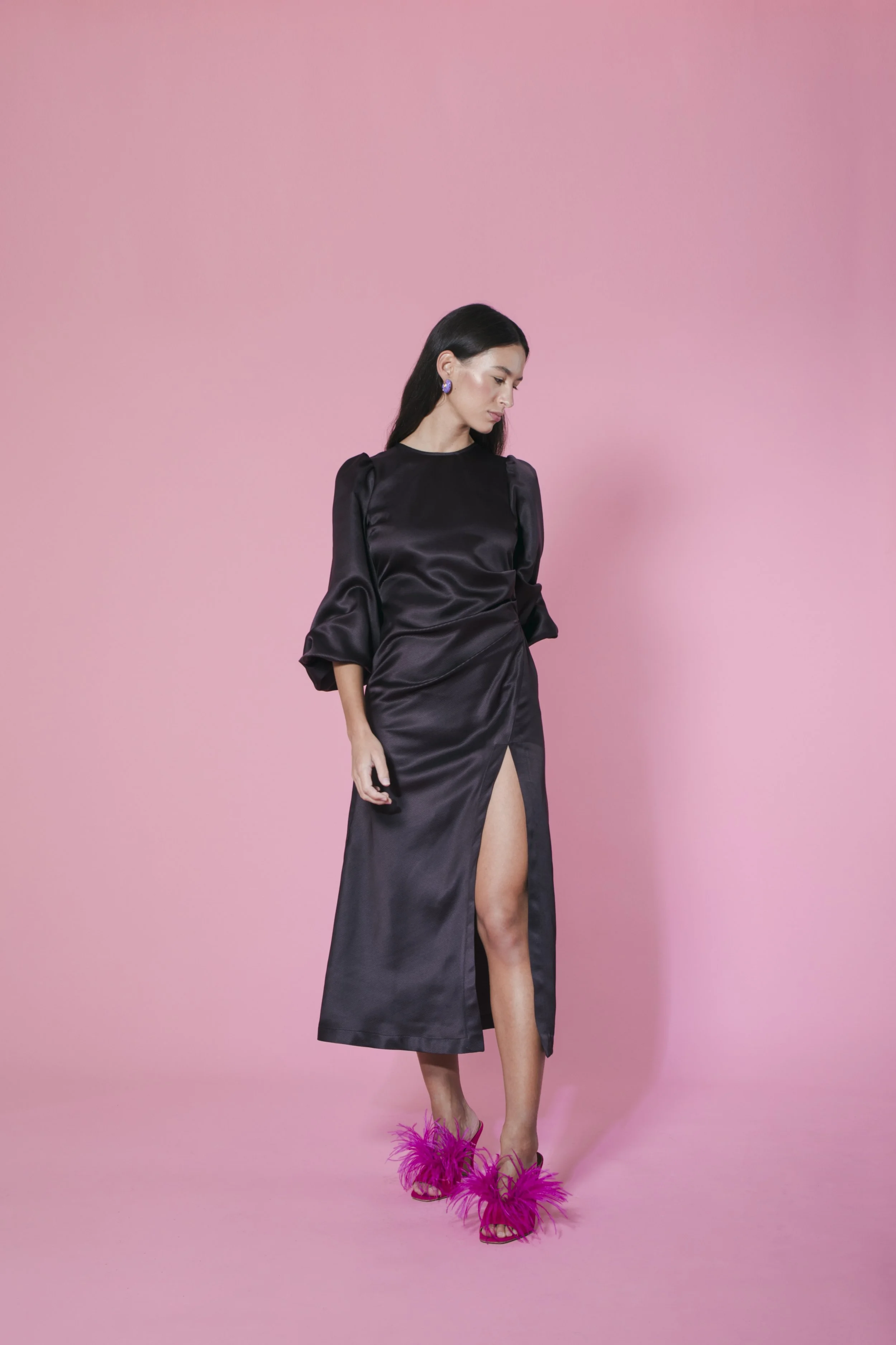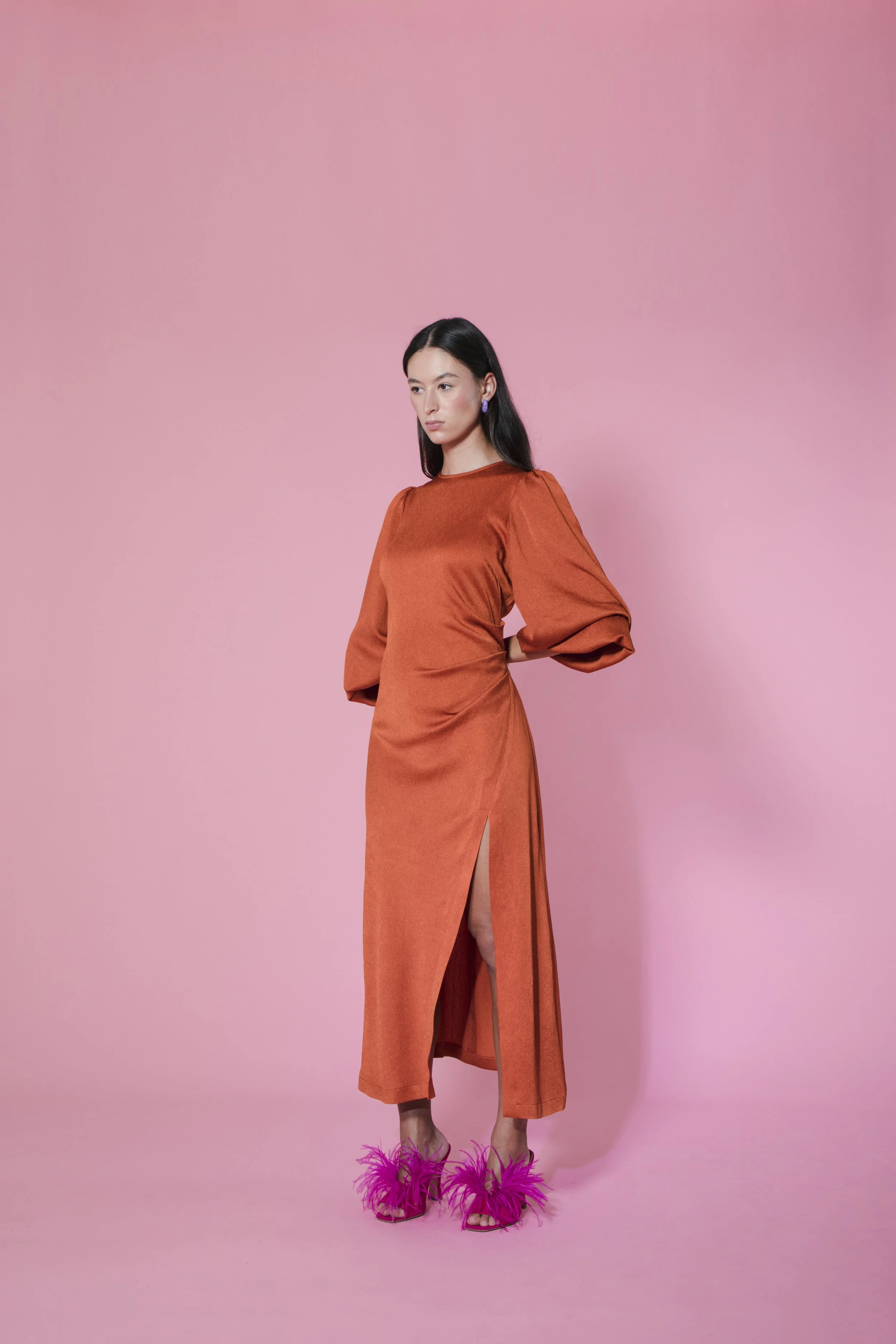Dettaglio con ruches laterali, girocollo sul davanti e sul retro, chiusura posteriore con zip, maniche lunghe e ampie, taglio nella parte anteriore, orlo dritto e lunghezza sotto il polpaccio. CONSCIOUS: questo articolo è realizzato in Italia con deadstock di tessuti italiani e veste la taglia indicata.
